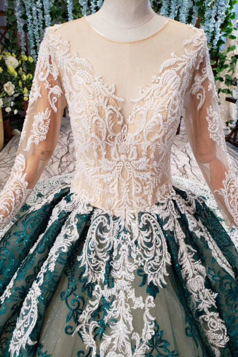 Graceful Fabulous Latest Green Sleeves Ball Lace Dress with Appliques Long Prom Gown