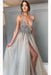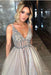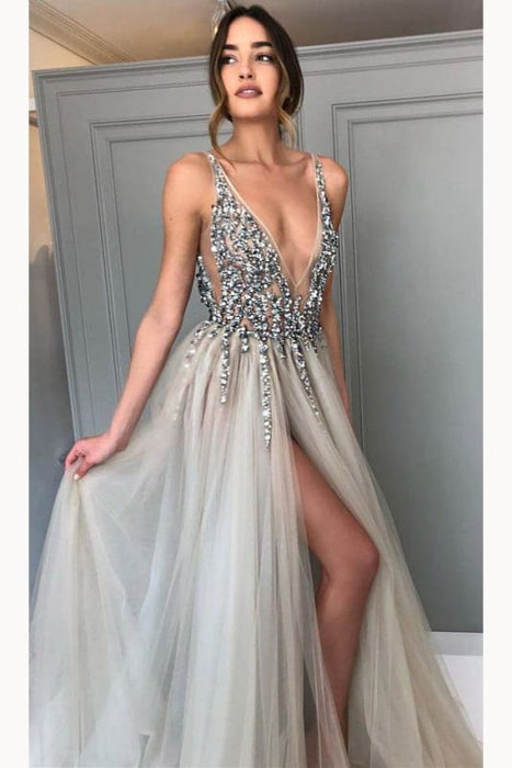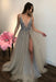 Gray Sequined Deep V Neck Prom with Left Slit A Line Tulle Evening Dress