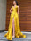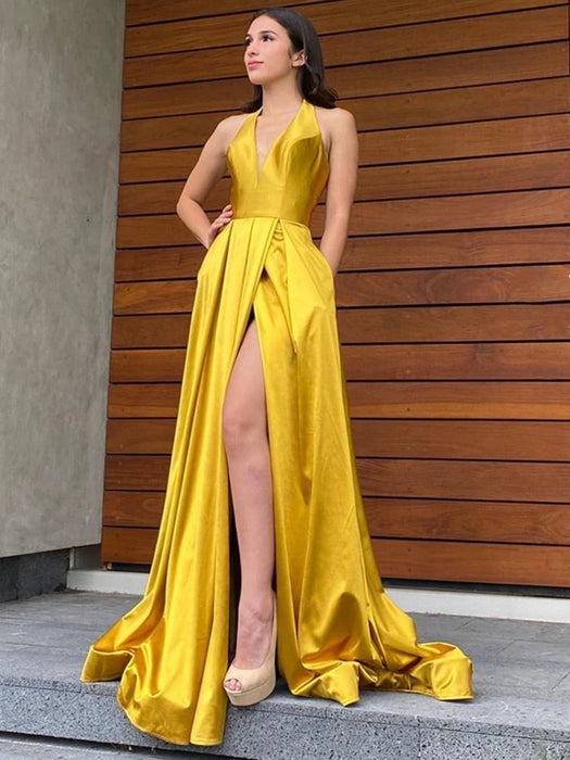 Halter V Neck Backless Yellow Long Prom Dresses with High Slit, Backless Yellow Formal Graduation Evening Dresses