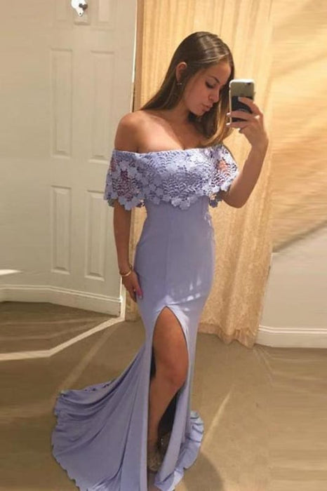 Lavender Off Shoulder Mermaid Split Evening with Lace Sexy Slit Prom Dress