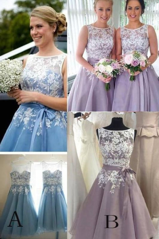 Lilac Lace Appliqued Sleeveless Bridesmaid Mini With Belt Short Prom Dress