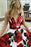 Red Floral Deep V Neck Sweep Train Printed Prom Dress