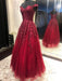 Burgundy lace takes center stage in this off-shoulder evening gown, designed for those seeking understated glamour. The delicate lace overlay creates intricate texture and visual interest, while the off-shoulder neckline reveals the collarbone with refined sophistication. An A-line silhouette elongates the frame, flowing gracefully to the floor for a dramatic entrance. The rich burgundy hue complements a range of skin tones and pairs effortlessly with classic accessories. Ideal for prom, galas, or formal celebrations where timeless elegance matters.