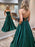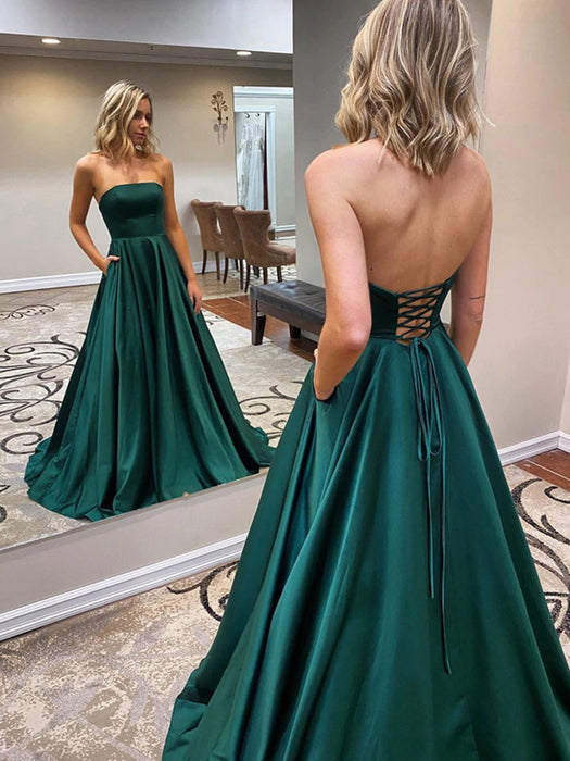 Open Back Strapless Green Satin Long Prom Dresses with Pocket, Strapless Green Formal Graduation Evening Dresses