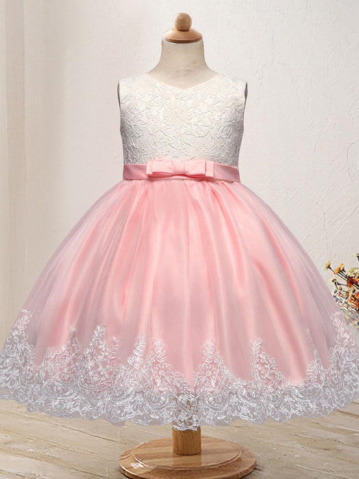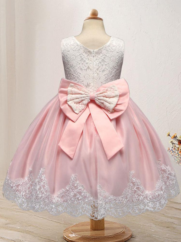 Pink Sleeveless Embroidered Kids Party Dresses Lace Appliques with Big Bowtie