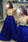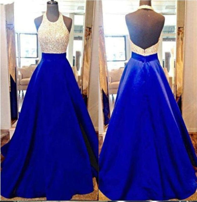 Royal Blue Halter Sleeveless Sparkly Long Prom Dresses with Beading Backless Formal Dress