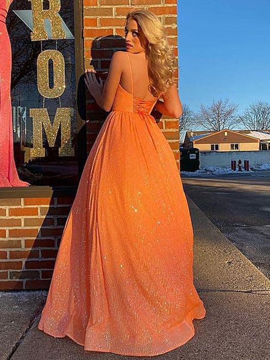 Shiny V Neck Backless Orange Long Prom Dresses, V Neck Orange Formal Dresses, Sparkly Orange Evening Dresses
