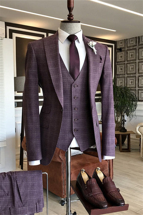 Stylish Purple Peaked Lapel Three Pieces Plaid Business Suits