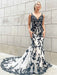 V Neck Mermaid White Long Prom Dresses with Blue Lace, Mermaid Blue Lace Formal Evening Dresses