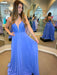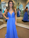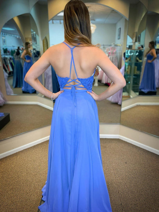 V Neck Open Back Blue Lace Long Prom Dresses, Blue Lace Formal Graduation Evening Dresses