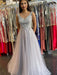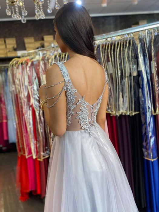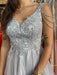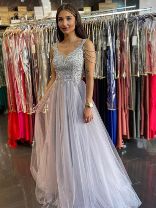 V Neck Open Back Gray Lace Long Prom Dresses, Long Grey Lace Formal Graduation Evening Dresses