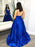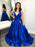 V Neck Royal Blue Satin Long Prom with Pocket, Royal Blue Formal Evening